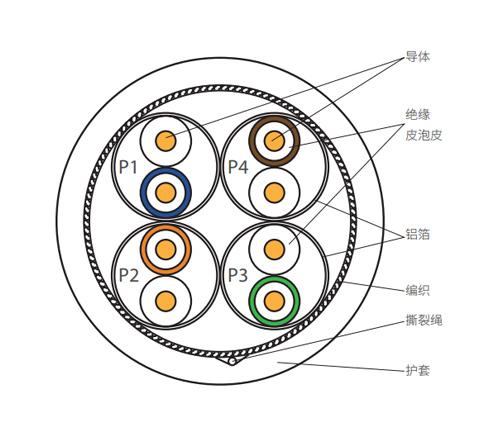 每个线对用金属铝箔单独包覆,4 对双绞线外整体金属网屏蔽大大减小了近端串扰和远端串扰的损耗 , 提供可靠的抗外部串扰能力